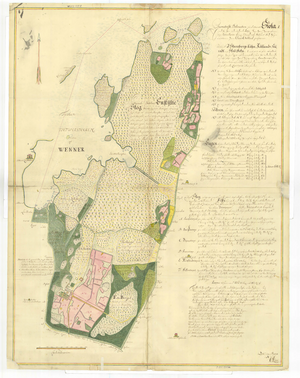 Über den Standort der Ekeblad-Eiche gibt es in der Forschung keine eindeutigen Angaben.[2] Tatsächlich legt die Vermessung von Stola aus dem Jahr 1728 (Karte 1, Karte 2) (Abb. 10, 11) nahe, dass der berühmte Eichbaum in einiger Entfernung nördlich vom Herrenhaus gestanden haben könnte, denn auf einer der beiden Karten ist ein mit dem Buchstaben ‚a‘ gekennzeichneter Baum besonders hervorgehoben (Abb. 159).